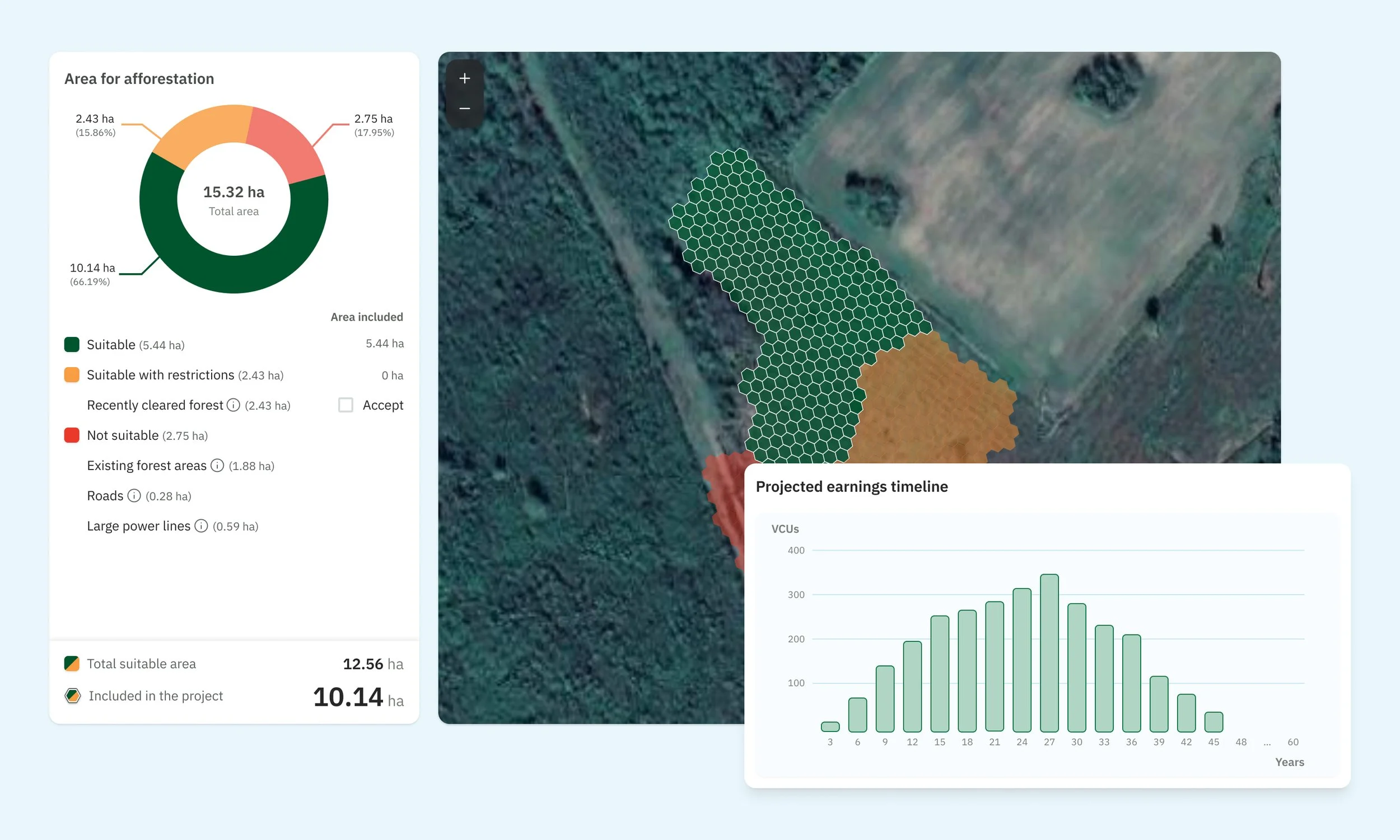We use a mix of data sources. Our platform overlays 50+ data layers, including high-resolution satellite imagery, soil metrics and species-specific local forest growth models. This allows us to assess each plot for legal eligibility, ecological suitability, and carbon potential.