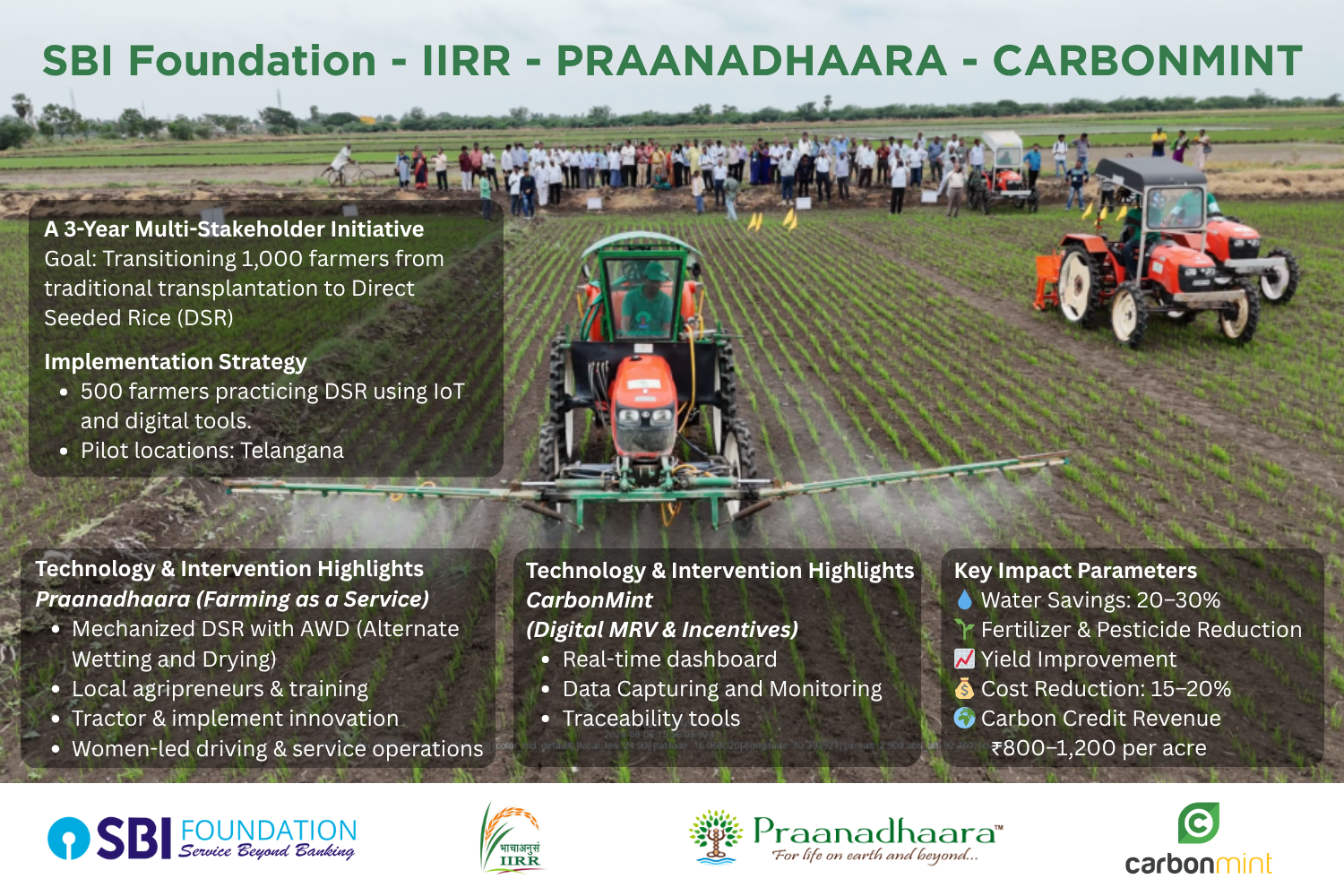 In 2025, we landed a project with the SBI Foundation aimed at transitioning 1,000 farmers from traditional transplantation based rice cultivation to Direct Seeded Rice (DSR), the most widely consumed staple crop globally. This project not only reduces water consumption by 20–30% and lowers cultivation costs, but also eases the labor burden of transplantation, a task typically performed by women. This shift addresses both a social and public health issue impacting women farmers. CarbonMint is proud to serve as a technology partner in this initiative, working alongside the Indian Institute of Rice Research and leading agronomy experts.
